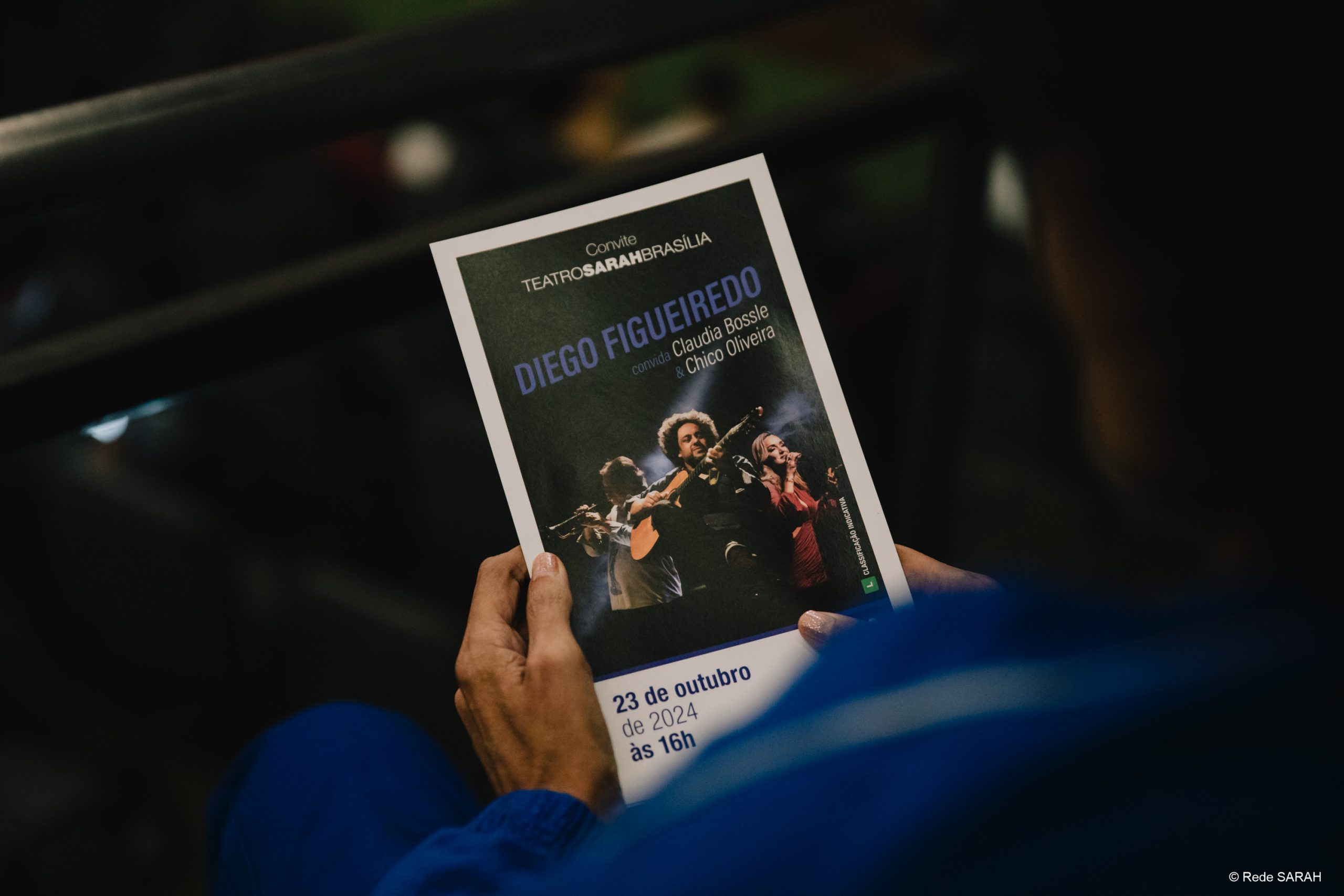 Na tarde de 23 de outubro, o Teatro SARAH recebeu mais uma vez em seu palco o musicista e violonista Diego Figueiredo e seus convidados, o maestro Chico Oliveira e a cantora Claudia Bossle. O trio, em uma sintonia vibrante, proporcionou a todos uma tarde memorável com diversidade de ritmos e clássicos da música popular brasileira.