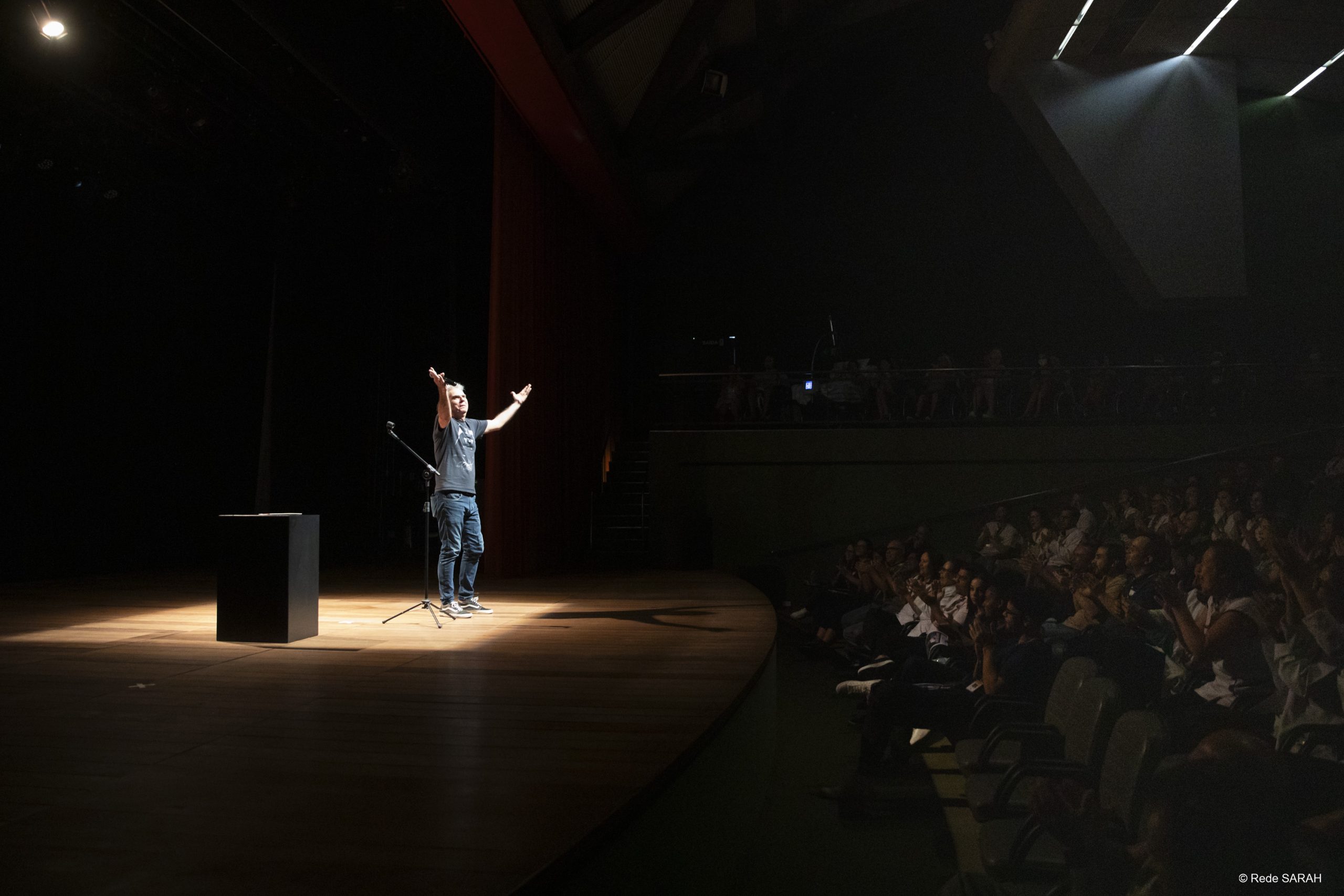 O comediante Nizo Neto apresentou o espetáculo humorístico “Aqui Tem Arte” na tarde do dia 21 de novembro de 2023, no Teatro SARAH. Seguindo o formato stand-up, em que o cômico – sozinho e de pé – interage com a plateia com improvisos e passagens ensaiadas, Nizo trouxe à comunidade SARAH um humor entre desinibido e escrachado.
