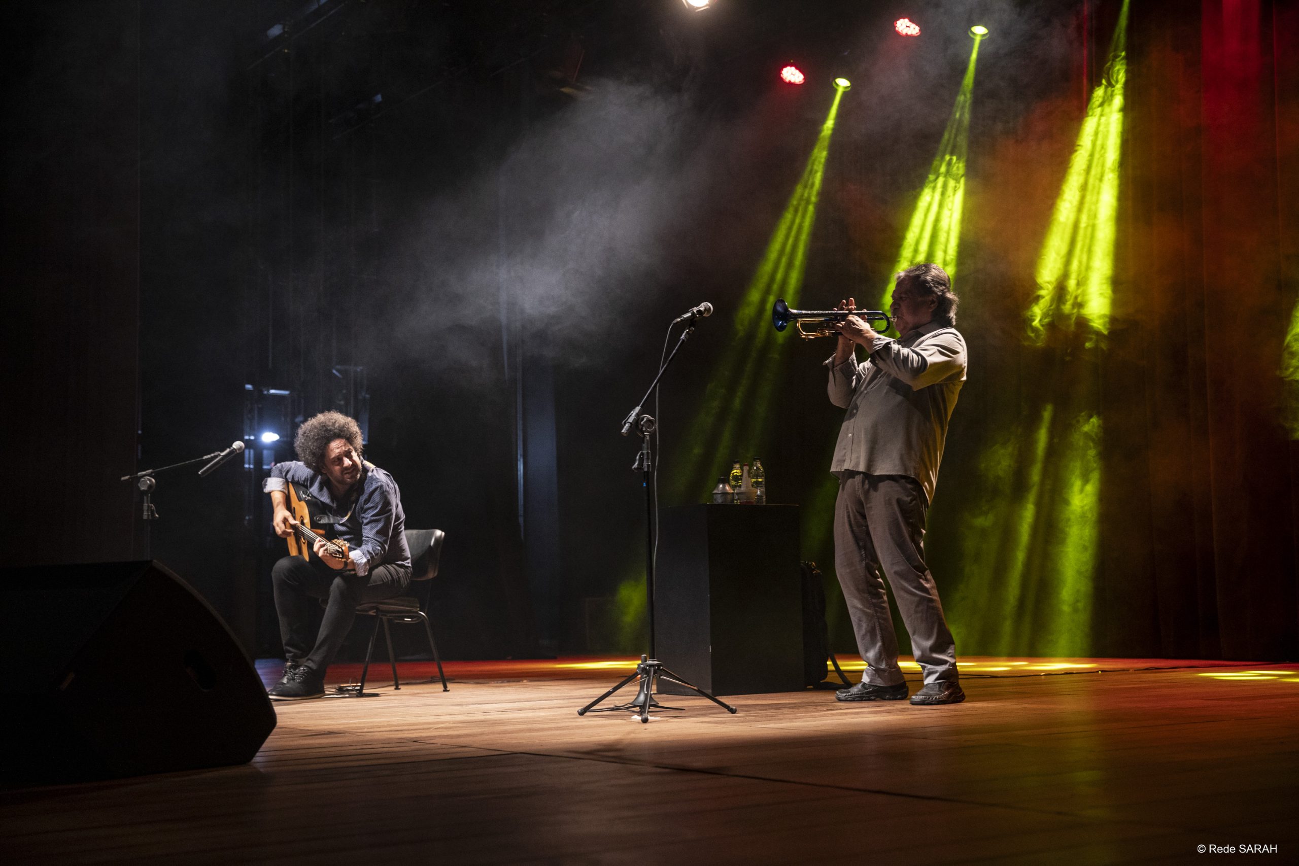 O violonista, guitarrista e compositor Diego Figueiredo e seu convidado, o trompetista e arranjador Chico Oliveira, apresentaram-se no Teatro SARAH Brasília, na tarde do dia 5 de dezembro de 2023, exclusivamente para pacientes, acompanhantes e colaboradores da Rede.
