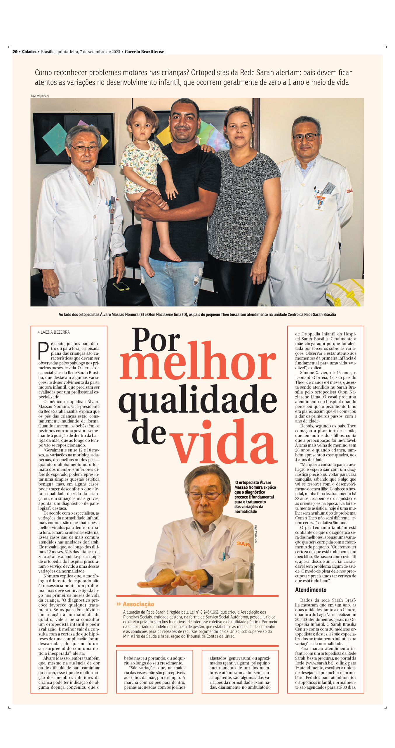 O jornal Correio Braziliense repercutiu um alerta dos especialistas em ortopedia infantil da Rede SARAH sobre variações da normalidade nos membros inferiores de crianças. Com o título “Atenção à parte motora da criança pode garantir melhor qualidade de vida”, a matéria do dia 7 de setembro de 2023 alertou que pais e responsáveis precisam estar atentos a malformações em quadris, pernas, joelhos e pés de suas crianças, especialmente antes de um ano e meio de idade.