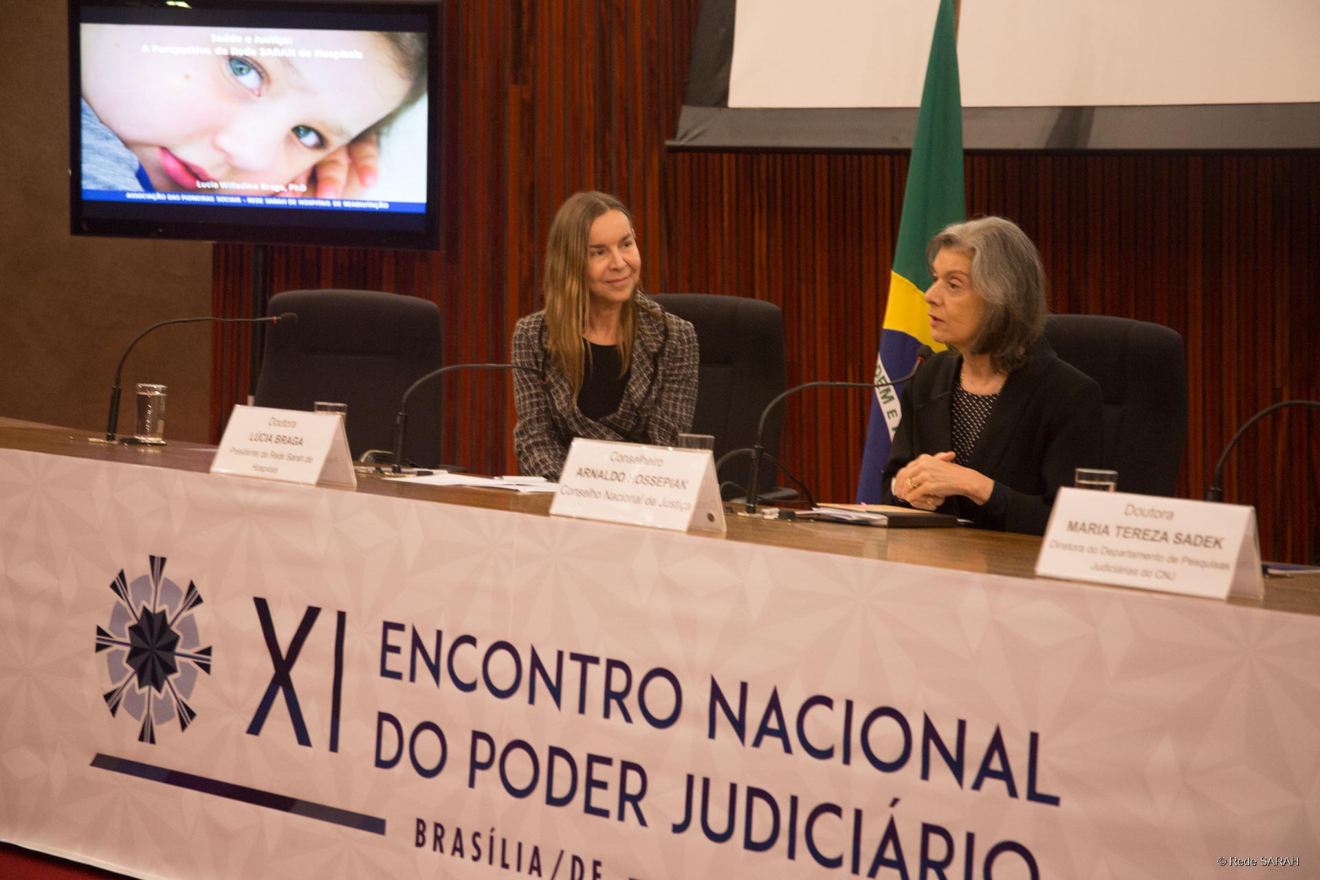 No dia 21 de novembro de 2017, Dra. Lúcia Willadino Braga, presidente da Rede SARAH, proferiu palestra durante o XI Encontro Nacional do Poder Judiciário, no Conselho Nacional de Justiça. Com o tema “Saúde e Justiça: A Perspectiva da Rede SARAH”, a palestra da neurocientista abordou os princípios filosóficos do tratamento oferecido pela Rede SARAH, baseado na coleta e na análise de evidências científicas. O convite foi feito pela Ministra Carmem Lúcia, presidente do Supremo Tribunal Federal e do CNJ. A cerimônia destacou o lançamento de uma plataforma do CNJ com dados técnicos, na área da saúde, para subsidiar a tomada de decisão dos tribunais.