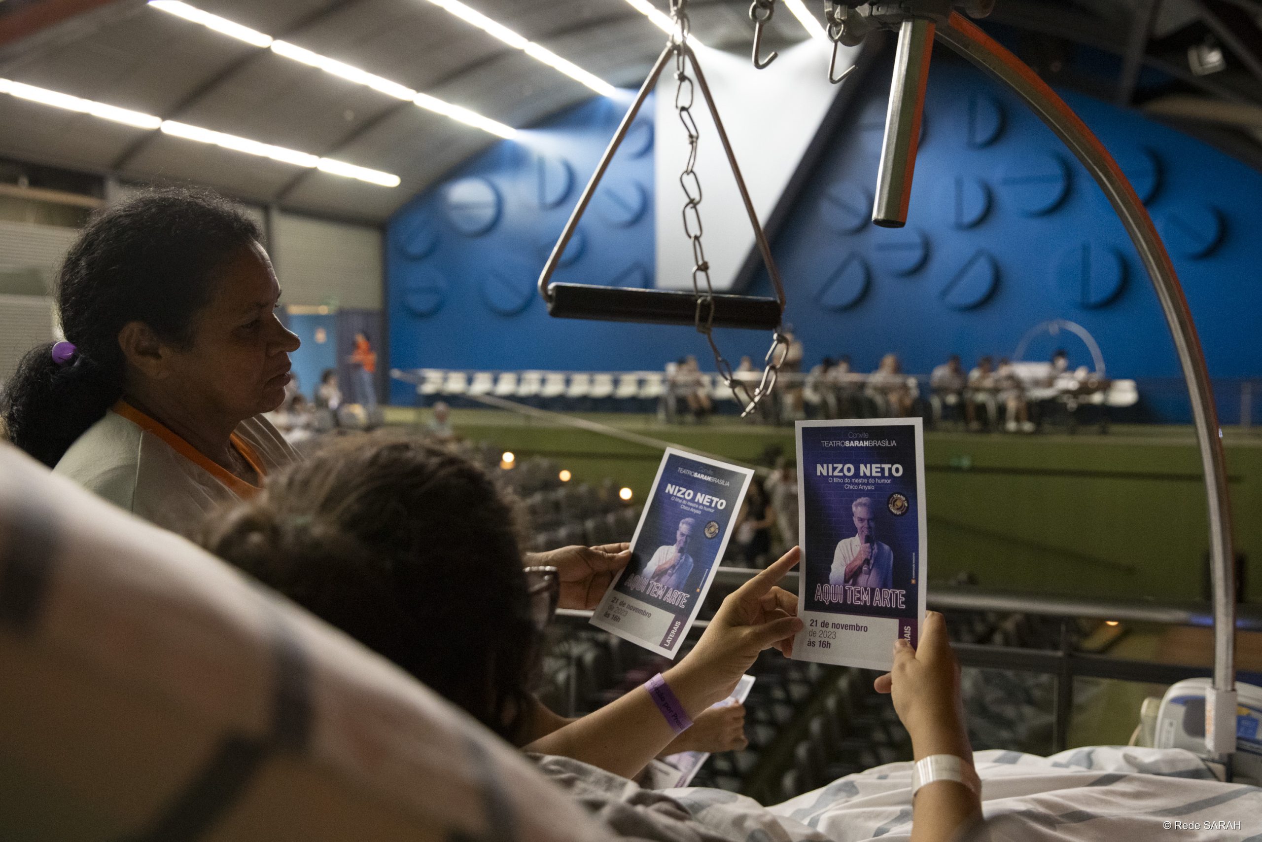 O comediante Nizo Neto apresentou o espetáculo humorístico “Aqui Tem Arte” na tarde do dia 21 de novembro de 2023, no Teatro SARAH. Seguindo o formato stand-up, em que o cômico – sozinho e de pé – interage com a plateia com improvisos e passagens ensaiadas, Nizo trouxe à comunidade SARAH um humor entre desinibido e escrachado.