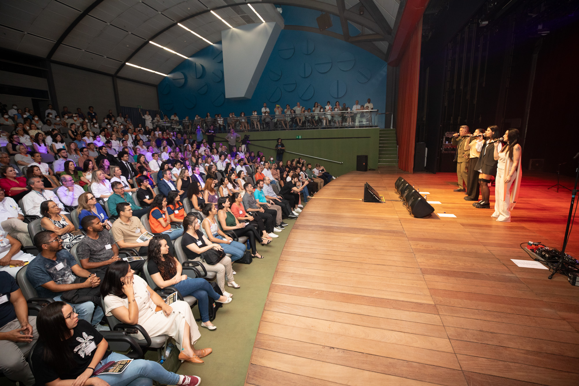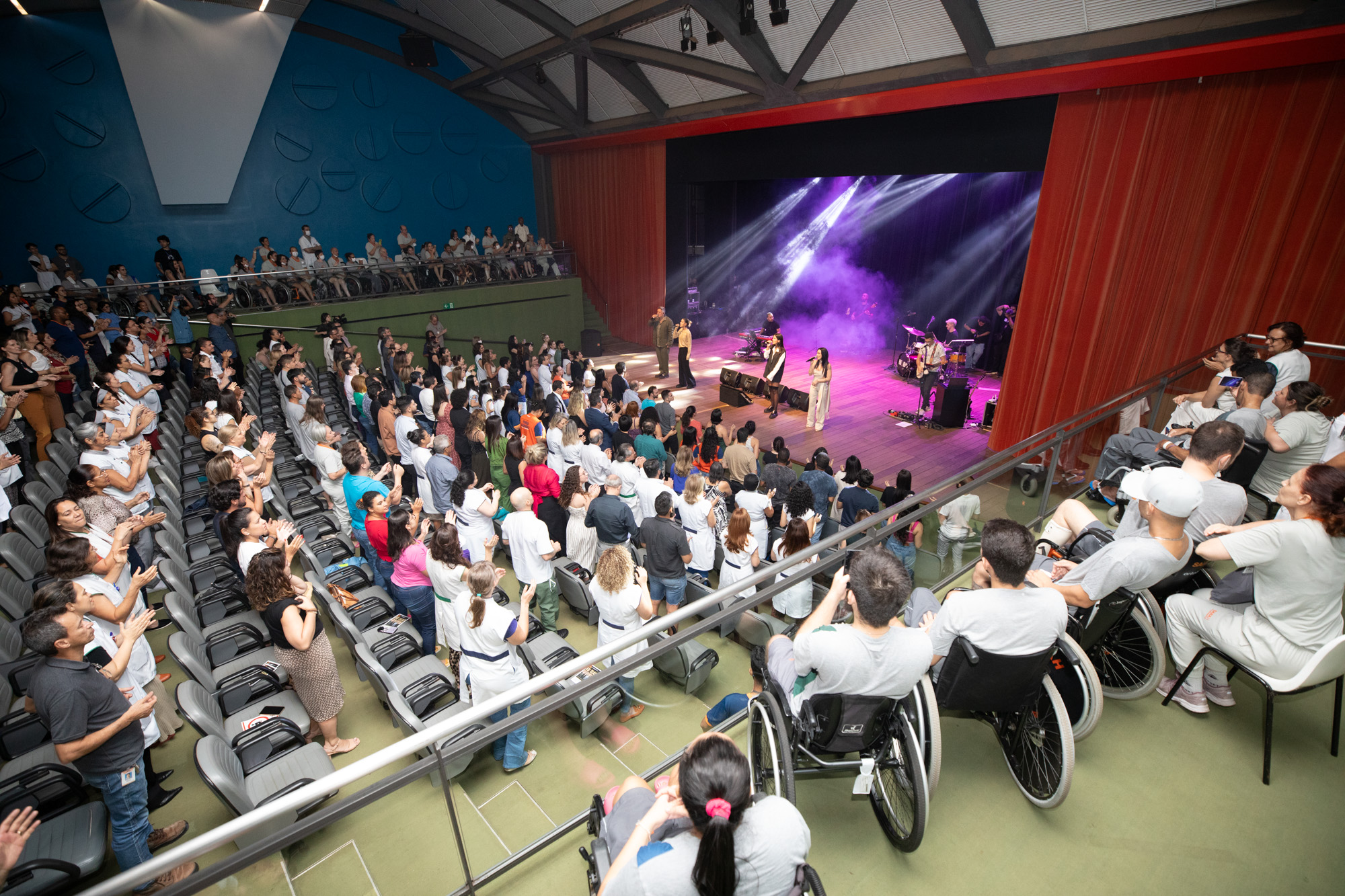 Mais de 500 pacientes, acompanhantes e colaboradores da comunidade SARAH lotaram o teatro especialmente projetado para receber pessoas em cadeiras de rodas e camas-maca.