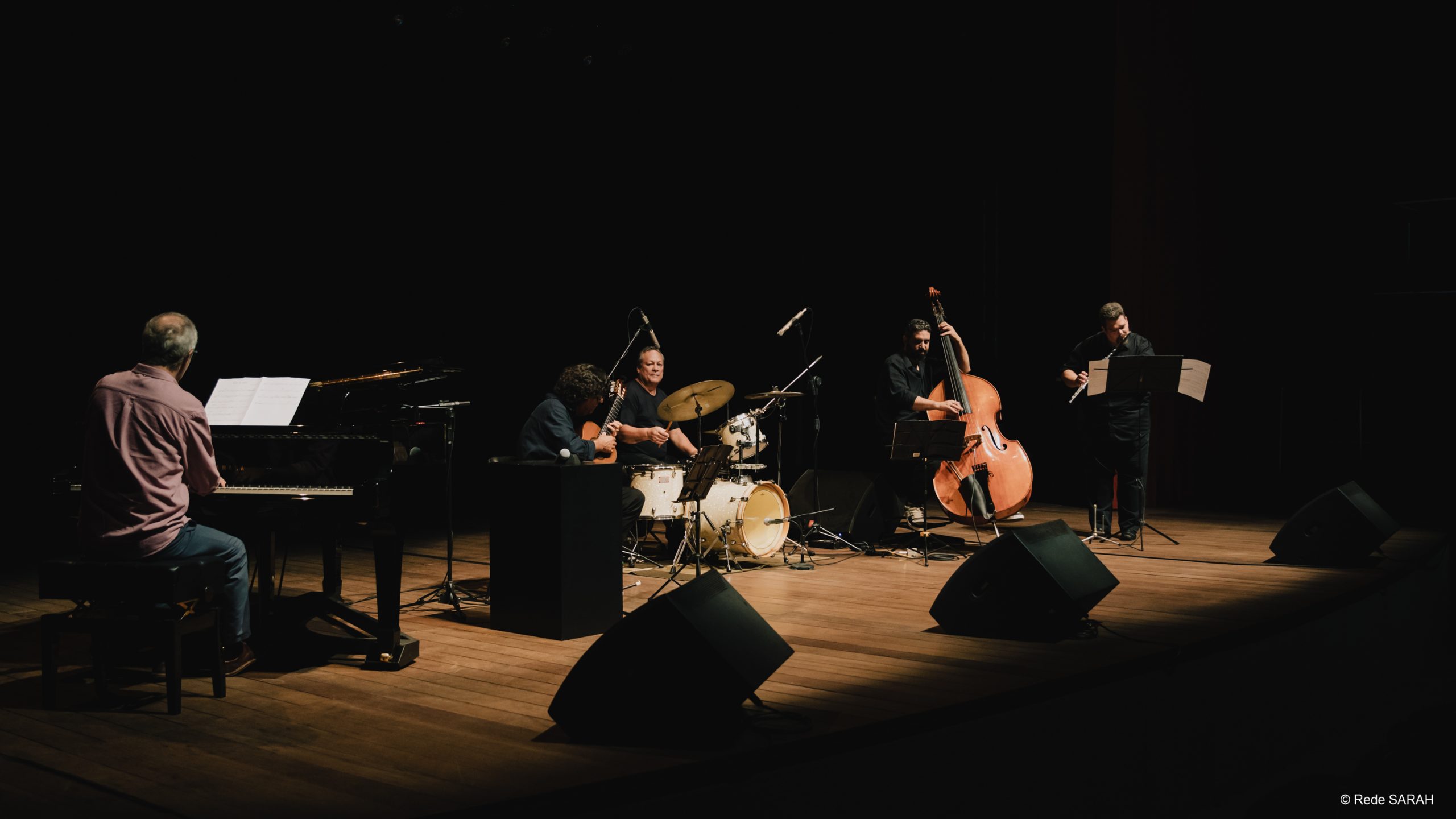 Em 25 de outubro, o Teatro SARAH ficou repleto pelos ritmos clássicos do jazz, choro, bossa nova e valsa em seu palco, com Jaime Ernest Dias e seu quinteto instrumental. Parte do trabalho autoral de Jaime, a iniciativa é composta por amigos do artista, contando com Renato Vasconcellos no piano, Igor Diniz no contrabaixo, Sérgio Morais na flauta e Erivélton Silva na bateria e, em uma improvisação impressionante, encantaram a todos os presentes com uma tarde acústica animada e suave.